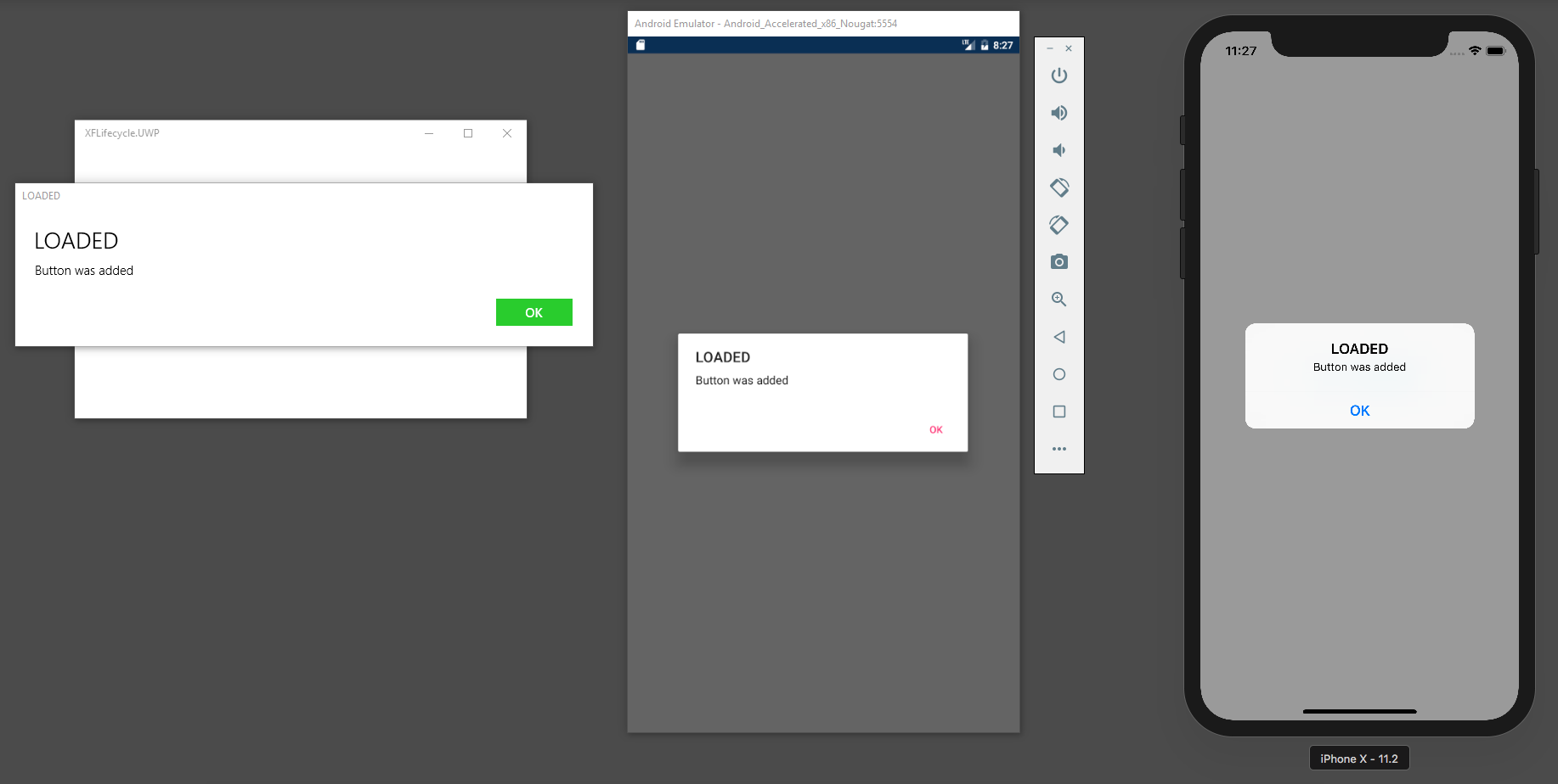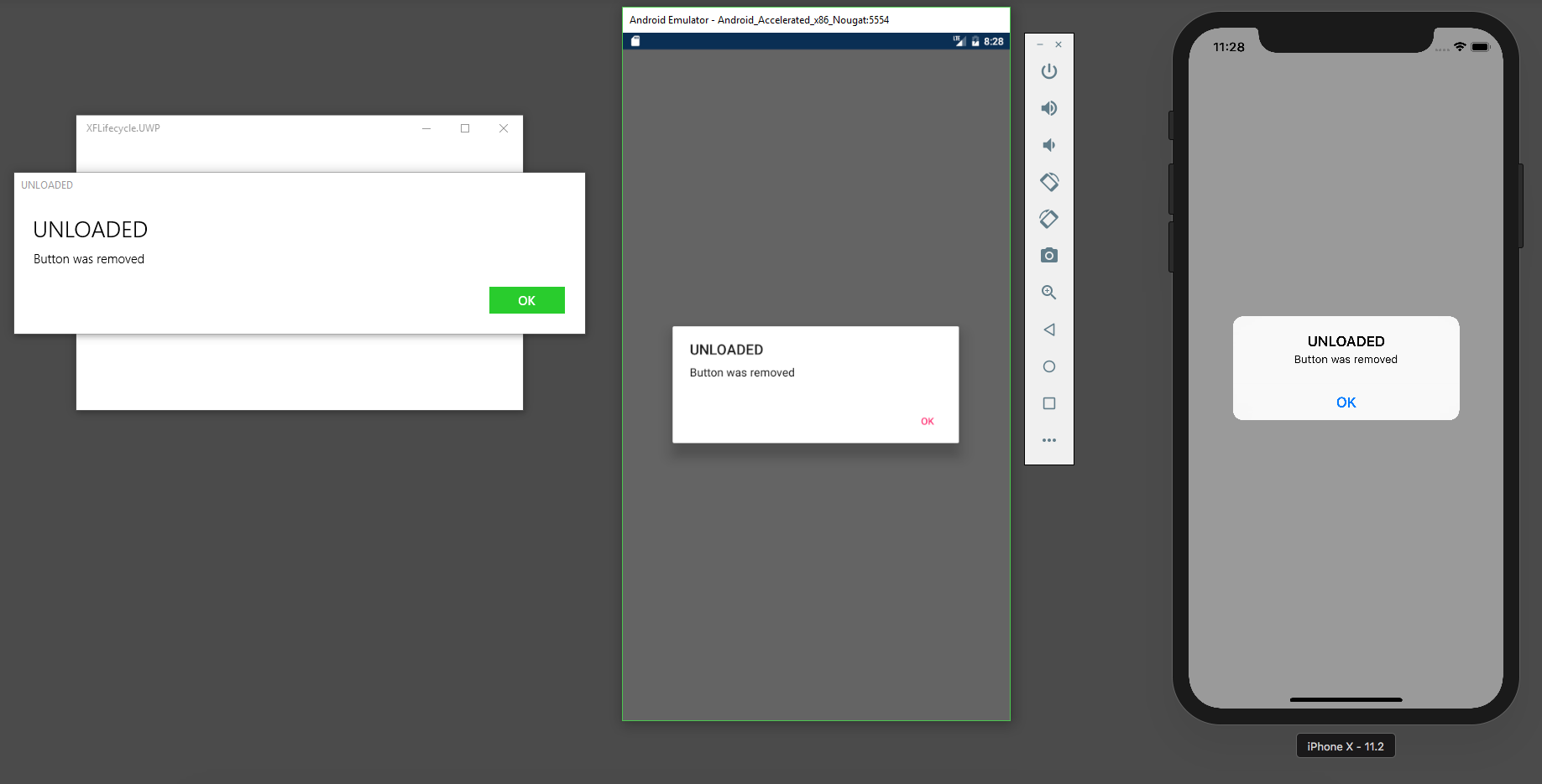 1 2 3 4 5 6 7 8 9 10 11 12 13 14 15 16 17 18 19 20 21 22 | public partial class MainPage : ContentPage{ public MainPage() { InitializeComponent(); } private void Button_OnClicked(object sender, EventArgs e) { MainContainer.Children.Clear(); } private void ViewLifecycleEffect_OnLoaded(object sender, EventArgs e) { DisplayAlert("LOADED", "Button was added", "OK"); } private void ViewLifecycleEffect_OnUnloaded(object sender, EventArgs e) { DisplayAlert("UNLOADED", "Button was removed", "OK"); }} |